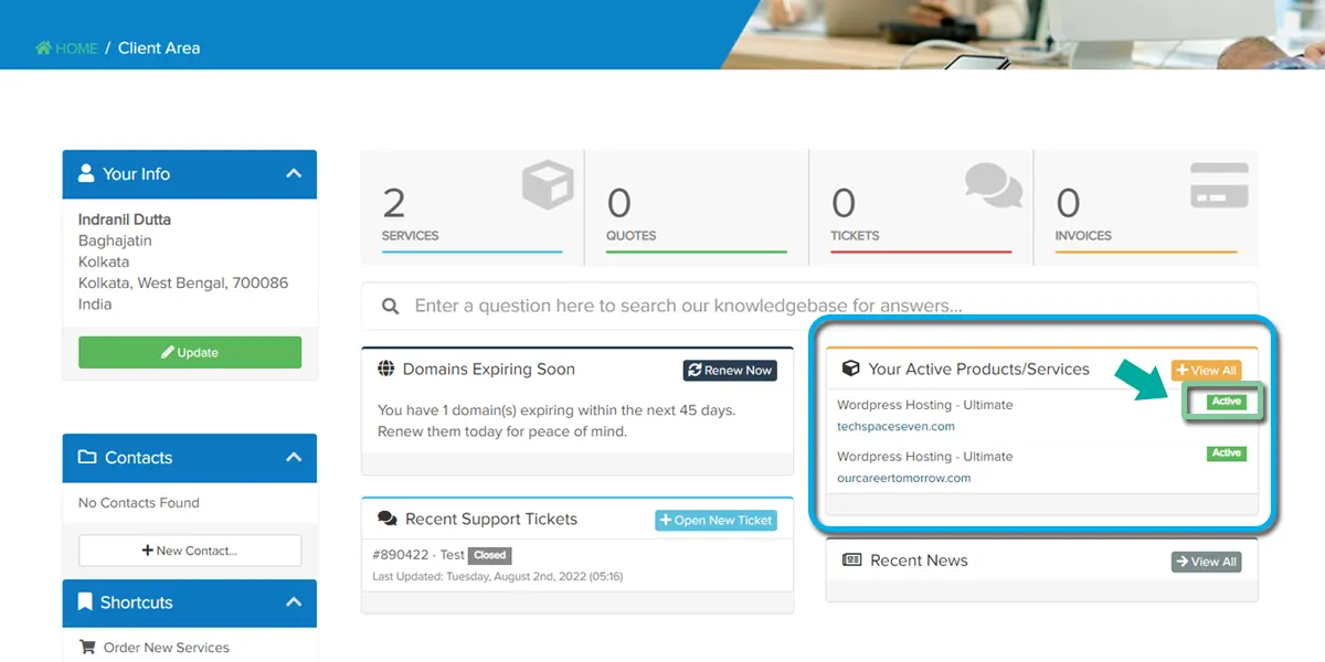 After logging in successfully, you are redirected to your client area, and now you can see your window. Click here to access the active product/ service tab.