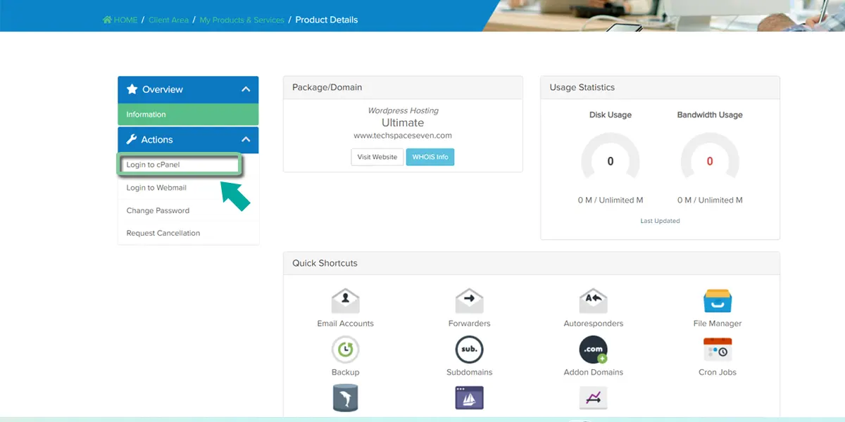 Now you can click on “Login to cPanel” in the left sidebar. Only click here, and you will be redirected to cPanel without a password.